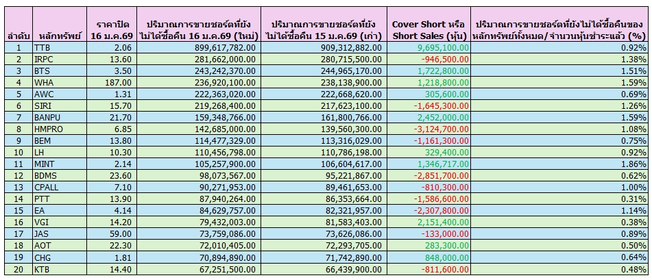 ผู้สื่อข่าวรายงานอ้างอิงการเปิดเผยข้อมูลของ ตลาดหลักทรัพย์แห่งประเทศไทย (ตลท.) เกี่ยวกับหลักทรัพย์ที่ยังคงสถานะการขายชอร์ตที่ยังไม่ได้ซื้อคืน (Outstanding Short Positions) ณ วันที่ 16 ม.ค.69 โดยพบว่ามีหลักทรัพย์ที่ยังคงสถานะการขายชอร์ตที่ยังไม่ได้ซื้อคืน (รวม NDVR) จำนวนทั้งหมด 231 หลักทรัพย์ โดยหุ้นที่คงสถานะขายชอร์ตที่ยังไม่ได้ซื้อคืนสูงสุด 5 อันดับแรกประกอบด้วย