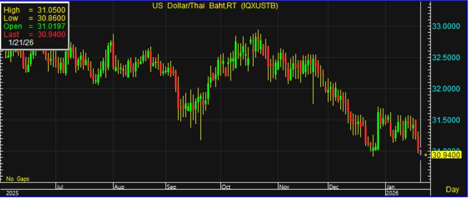 ค่าเงินบาทแข็งค่ามาอยู่ที่ระดับ 30.94 บาทต่อดอลลาร์ แตะระดับแข็งค่าสุดในรอบเกือบ 4 ปี 10 เดือน ตามการอ่อนค่าของเงินดอลลาร์ ท่ามกลางความกังวลนักลงทุนต่อความเสี่ยงสงครามการค้าระหว่างสหรัฐและยุโรป จากปมท่าทีสหรัฐเกี่ยวกับเกาะกรีนแลนด์