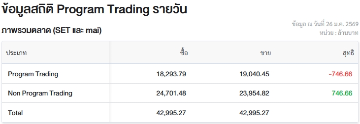 ผู้สื่อข่าวรายงานว่า วันนี้ (26 ม.ค.69) ตลาดหลักทรัพย์แห่งประเทศไทย (ตลท.) เปิดเผยข้อมูลซื้อขายรายวันผ่าน Program Trading หรือ “โปรแกรมโรบอทเทรดดิ้ง” พบว่ามีมูลค่าซื้อจำนวน 18,293.79 ล้านบาท และมูลค่าขายจำนวน 19,040.45 ล้านบาท เท่ากับขายสุทธิ 746.66 ล้านบาท