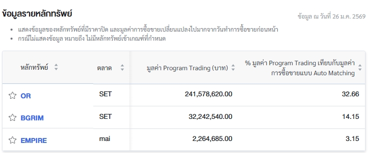 นอกจากนี้ ตลาดหลักทรัพย์แห่งประเทศไทย (ตลท.) รายงานข้อมูลหลักทรัพย์ที่มีการซื้อขายผ่านระบบ Program Trading สูงสุด โดยพิจารณาจากสัดส่วนมูลค่า Program Trading เทียบกับมูลค่าการซื้อขายแบบ Auto Matching พบว่ามี หลักทรัพย์ที่มีการทำรายการสูงสุดในวันนี้ ได้แก่ OR, BGRIM และ EMPIRE