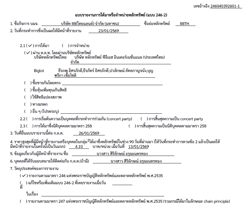 ผู้สื่อข่าวรายงานว่า วันนี้ (26 มกราคม 2569) สำนักงานคณะกรรมการกำกับหลักทรัพย์และตลาดหลักทรัพย์ รายงานผ่านแบบ 246-2 ว่า นางสาวสิริลักษณ์ อรุณเนตรทอง รายงานการได้มาของหุ้น บริษัท 88(ไทยแลนด์) จำกัด (มหาชน) หรือ 88TH เมื่อวันที่ 23 มกราคม 2569 ผ่านรายการ Big lot โดยซื้อจาก นายธีรภพ อิศรภักดี, นายธีรภัทร์ อิศรภักดี, นางสาวปวลักษณ์ ลัทธกาญจนัง และนางสาวบุญฑริกา เชื้อโชติ ผ่านบริษัท บริษัทหลักทรัพย์ ซีจีเอส อินเตอร์เนชันแนล (ประเทศไทย) จำกัด รวมจำนวหุ้นที่ซื้อมาทั้งหมด 17,000,000 หุ้น  คิดเป็นสัดส่วน 8% ของสิทธิออกเสียงทั้งหมดในกิจการ