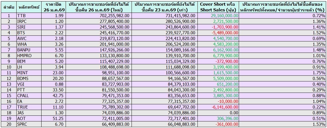 ข้อมูลสิ้นสุด 26 ม.ค.69 พบ TTB มีปริมาณชอร์ตคงค้างเหลือมากสุด 702 ล้านหุ้น คิดเป็น 0.72% และถูก Cover Short สูงสุด 29 ล้านหุ้น ส่วน TRUE ถูก Short Sales สูงสุด 6 ล้านหุ้น