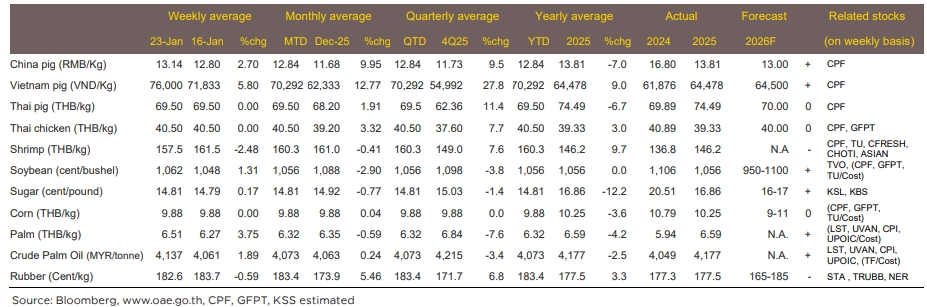 ขณะที่ราคาสุกรเวียดนามเพิ่มขึ้น +5.8% เทียบไตรมาสก่อนหน้าที่ 76,000 ดอง หรือ 91.20 บาท (ต้นทุนการเลี้ยง 43,000 ดอง) จากโรคอหิวาต์แอฟริการะบาด (ASF) จึงยังคงจำกัดสุกรเข้าสู่ตลาด ขณะที่ความต้องการเพิ่มขึ้นเพื่อเตรียมเทศกาลตรุษญวน (Tet Holiday-เหมือนตรุษจีน) ส่วนราคาสุกรจีนเพิ่มขึ้น 2.7% เทียบสัปดาห์ก่อนหน้าที่ 13.14 หยวน หรือ 59.40 บาท (ต้นทุนการเลี้ยง 13.50 หยวน) จากความต้องการเพิ่มขึ้นล่วงหน้าก่อนตรุษจีน
