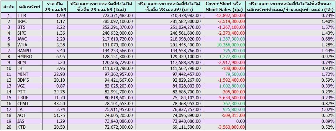 ข้อมูลสิ้นสุด 29 ม.ค.69 พบ TTB มีปริมาณชอร์ตคงค้างเหลือมากสุด 723 ล้านหุ้น คิดเป็น 0.74% และถูก Short Sales สูงสุด 12 ล้านหุ้น ส่วน WHA ถูก Cover Short สูงสุด 10 ล้านหุ้น