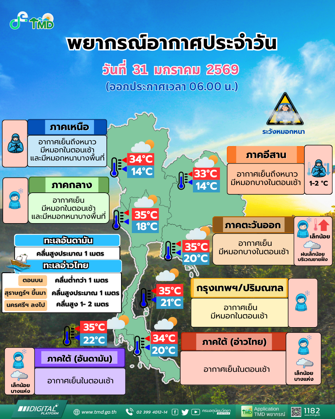 อนึ่ง ในช่วงวันที่ 1-4 ก.พ. 69 ประเทศไทยตอนบนจะมีอุณหภูมิลดลง เนื่องจากบริเวณความกดอากาศสูงหรือมวลอากาศเย็นกำลังปานกลางระลอกใหม่จากประเทศจีนจะแผ่ลงมาปกคลุมประเทศไทยตอนบนและทะเลจีนใต้