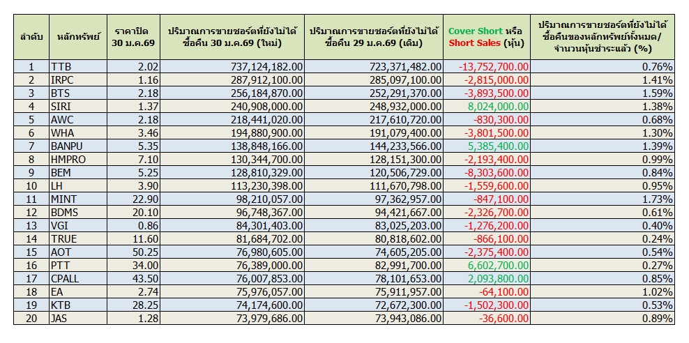 ข้อมูลสิ้นสุด 30 ม.ค.69 พบ TTB มีปริมาณชอร์ตคงค้างเหลือมากสุด 737 ล้านหุ้น คิดเป็น 0.76% และถูก Short Sales สูงสุด 13 ล้านหุ้น ส่วน SIRI ถูก Cover Short สูงสุด 8 ล้านหุ้น