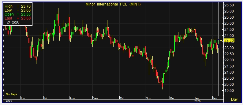 ผู้สื่อข่าวรายงานว่า วันนี้ (2 ก.พ.69) ราคาหุ้นบริษัท ไมเนอร์ อินเตอร์เนชั่นแนล จำกัด (มหาชน) หรือ MINT ณ เวลา 10:17 น. อยู่ที่ระดับ 23.60 บาท บวก 0.70 บาท หรือ 3.06% ราคาสูงสุด 23.70 บาท ราคาต่ำสุด 23 บาท ด้วยมูลค่าซื้อขาย 203.11 ล้านบาท