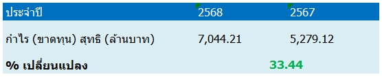 บริษัทเปิดเผยผลการดำเนินงานปี 2568 มีกำไรจากการลงทุนสุทธิ 6,244.3 ล้านบาท เพิ่มขึ้น 4.44% จากปีก่อน แม้รายได้รวมอยู่ในระดับทรงตัวที่ 7,516.9 ล้านบาท ลดลงเล็กน้อย 0.13% จากปีก่อน