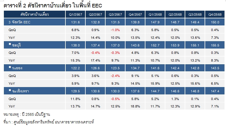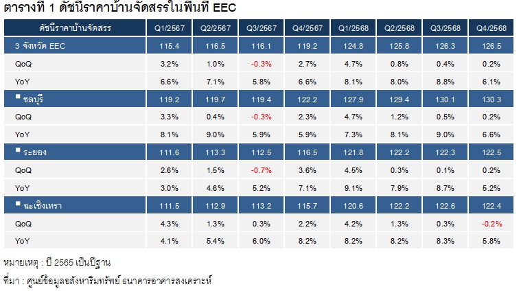 การเพิ่มขึ้นของดัชนีดังกล่าวมีปัจจัยสนับสนุนสำคัญจาก ต้นทุนการพัฒนาโครงการที่ปรับตัวสูงขึ้น ประกอบกับราคาที่ดินในพื้นที่บริเวณนิคมอุตสาหกรรมที่ปรับตัวเพิ่มขึ้นอย่างต่อเนื่อง นอกจากนี้การขยายตัวของอุตสาหกรรมใหม่ในพื้นที่ EEC ส่งผลให้เกิดการจ้างงานเพิ่มขึ้น และดึงดูดแรงงานทั้งชาวไทยและชาวต่างชาติให้เข้ามาทำงานในพื้นที่มากขึ้น ส่งผลให้ ความต้องการที่อยู่อาศัย โดยเฉพาะบ้านจัดสรร ปรับตัวเพิ่มขึ้นตามการเติบโตของกิจกรรมทางเศรษฐกิจในพื้นที่
