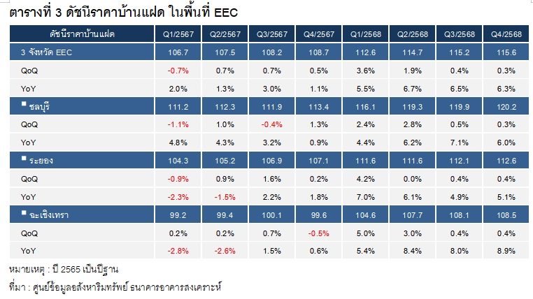 REIC เปิดดัชนีบ้านจัดสรรในพื้นที่ EEC ไตรมาส 4/68 แตะ 126.5 จุด เพิ่มขึ้น 6.1% เทียบปีก่อน ตามแรงหนุนการลงทุนและการจ้างงานในพื้นที่นิคมอุตสาหกรรม โดยทำเลชลบุรี ระยอง และฉะเชิงเทรายังคงโดดเด่น