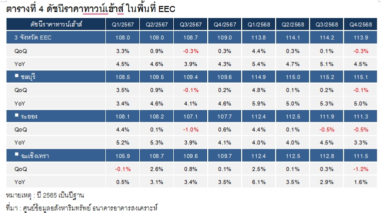 ศูนย์ข้อมูลอสังหาริมทรัพย์ (REIC) ธนาคารอาคารสงเคราะห์ (ธอส.) จัดทำบทวิเคราะห์ เรื่อง “ดัชนีราคาบ้านจัดสรรในพื้นที่ EEC ไตรมาส 4 ปี 2568” มีค่าอยู่ที่ 126.5 จุด เพิ่มขึ้นร้อยละ 6.1 เมื่อเทียบกับช่วงเดียวกันของปีก่อน (YoY) ซึ่งมีค่าดัชนีอยู่ที่ 119.2 จุด และเพิ่มขึ้นร้อยละ 0.2 เมื่อเทียบกับไตรมาสก่อน (QoQ) สะท้อนให้เห็นว่าราคาบ้านจัดสรรในพื้นที่ EEC ยังคงปรับตัวสูงขึ้นจากปีก่อน แต่มีแนวโน้มราคาทรงตัวเมื่อเทียบกับไตรมาสก่อน