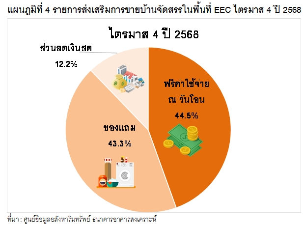สำหรับรายการส่งเสริมการขายบ้านจัดสรรที่อยู่ระหว่างการขายในไตรมาสนี้ พบว่า ส่วนใหญ่เป็นการฟรีค่าใช้จ่าย ณ วันโอนกรรมสิทธิ์ ร้อยละ 44.5 รองลงมาเป็นการให้ของแถม เช่น ฟรีเครื่องปรับอากาศ ผ้าม่าน เฟอร์นิเจอร์ ฯลฯ ร้อยละ 43.3 และเป็นการให้ส่วนลดเงินสดร้อยละ 12.2 (รายละเอียดตามแผนภูมิที่ 4)