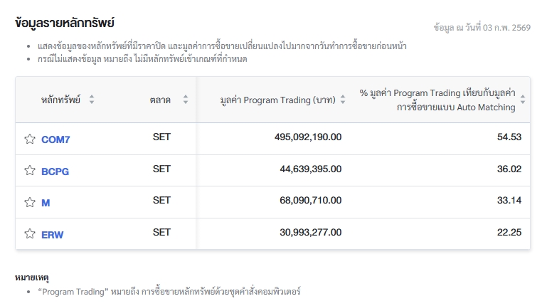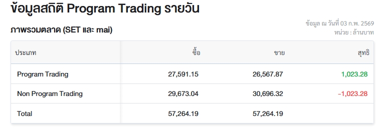 ผู้สื่อข่าวรายงานว่า วันนี้ (3 ก.พ.69) ตลาดหลักทรัพย์แห่งประเทศไทย (ตลท.) เปิดเผยข้อมูลซื้อขายรายวันผ่าน Program Trading หรือ “โปรแกรมโรบอทเทรดดิ้ง” พบว่ามีมูลค่าซื้อจำนวน 27,591.15 ล้านบาท และมูลค่าขายจำนวน 26,567.87 ล้านบาท เท่ากับซื้อสุทธิ 1,023.28 ล้านบาท