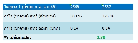 โดยกำไรไตรมาส 1 ปี 2569 สิ้นสุดวันที่ 31 ธันวาคม 2568 เพิ่มขึ้น จากรายได้รวมอยู่ที่ จำนวน 3,537.6 ล้านบาท เพิ่มขึ้นร้อยละ 7.8 จากช่วงเดียวกันของปีก่อน โดยส่วนใหญ่มาจากรายได้จากการขายอสังหาริมทรัพย์ที่เพิ่มขึ้น