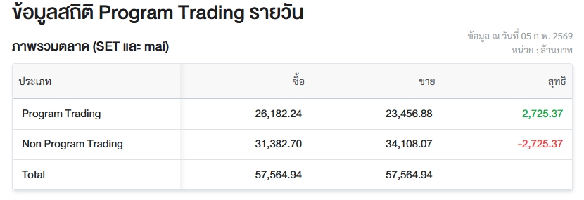 ผู้สื่อข่าวรายงานว่า วันนี้ (5 ก.พ.69) ตลาดหลักทรัพย์แห่งประเทศไทย (ตลท.) เปิดเผยข้อมูลซื้อขายรายวันผ่าน Program Trading หรือ “โปรแกรมโรบอทเทรดดิ้ง” พบว่ามีมูลค่าซื้อจำนวน 26,182.24 ล้านบาท และมูลค่าขายจำนวน 23,456.88 ล้านบาท เท่ากับซื้อสุทธิ 2,725.37 ล้านบาท