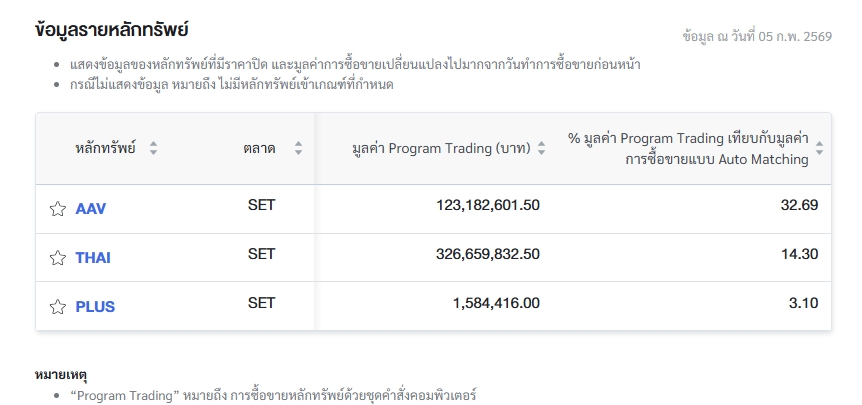 โดย บริษัท เอเชีย เอวิเอชั่น จำกัด (มหาชน) หรือ AAV มีมูลค่าการซื้อขายผ่าน Program Trading จำนวน 123.18 ล้านบาท คิดเป็น 32.69% ของมูลค่าการซื้อขายแบบ Auto Matching ซึ่งอยู่ที่ 376.85 ล้านบาท