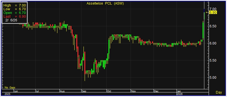 ผู้สื่อข่าวรายงานว่า วันนี้ (6 ก.พ.69) ราคาหุ้น บริษัท แอสเซทไวส์ จำกัด (มหาชน) หรือ ASW ณ เวลา 10:46 บาท อยู่ที่ระดับ 6.90 บาท บวก 0.30 บาท หรือ 4.55% สูงสุดที่ระดับ 7 บาท ต่ำสุดที่ระดับ 6.70 บาท ด้วยมูลค่าการซื้อขาย 2.76 ล้านบาท