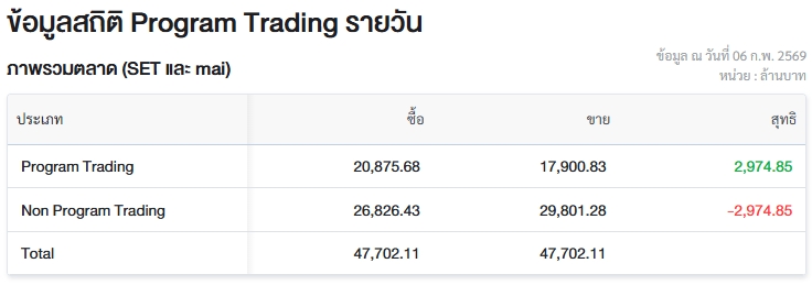 ผู้สื่อข่าวรายงานว่า วันนี้ (6 ก.พ.69) ตลาดหลักทรัพย์แห่งประเทศไทย (ตลท.) เปิดเผยข้อมูลซื้อขายรายวันผ่าน Program Trading หรือ “โปรแกรมโรบอทเทรดดิ้ง” พบว่ามีมูลค่าซื้อจำนวน 20,875.68 ล้านบาท และมูลค่าขายจำนวน 17,900.83 ล้านบาท เท่ากับซื้อสุทธิ 2,974.85 ล้านบาท