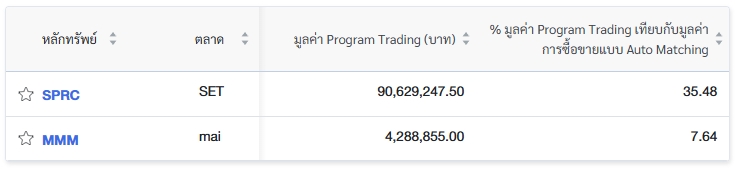 นอกจากนี้ ตลาดหลักทรัพย์แห่งประเทศไทย (ตลท.) รายงานข้อมูลหลักทรัพย์ที่มีการซื้อขายผ่านระบบ Program Trading สูงสุด โดยพิจารณาจากสัดส่วนมูลค่า Program Trading เทียบกับมูลค่าการซื้อขายแบบ Auto Matching พบว่ามี 2 หลักทรัพย์ที่มีการทำรายการสูงสุดในวันนี้ ได้แก่ SPRC และ MMM