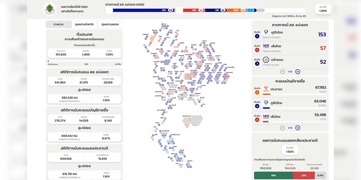 ปิดหีบ 2 ชม.! ผลคะแนน กกต. “ภูมิใจไทย” นำ 153 ที่นั่ง “เพื่อไทย” กวาด 57 เก้าอี้