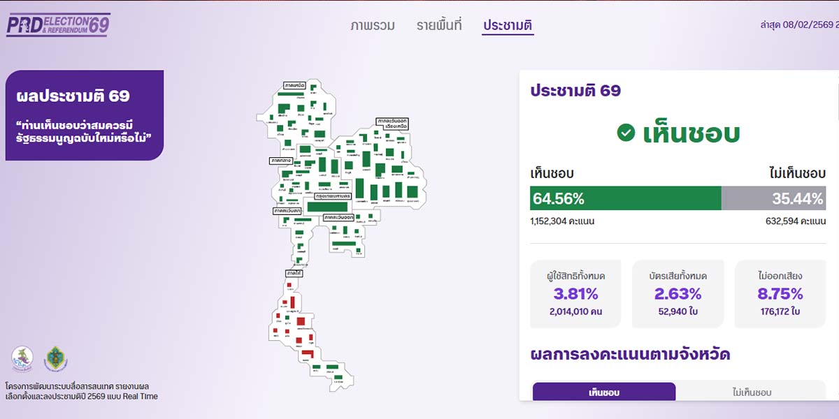 ผู้สื่อข่าวรายงานว่า วันนี้ (8 ก.พ.69) เวลา 20:01 น. กรมประชาสัมพันธ์ รายงานความเคลื่อนไหวการนับคะแนนประชามติผ่านระบบ “PRD Election & Referendum 69” ภายหลังการปิดหีบบัตรเลือกตั้งสมาชิกสภาผู้แทนราษฎร (สส.) และบัตรออกเสียงประชามติพร้อมกันทั่วไทยเมื่อช่วงเย็นที่ผ่านมา