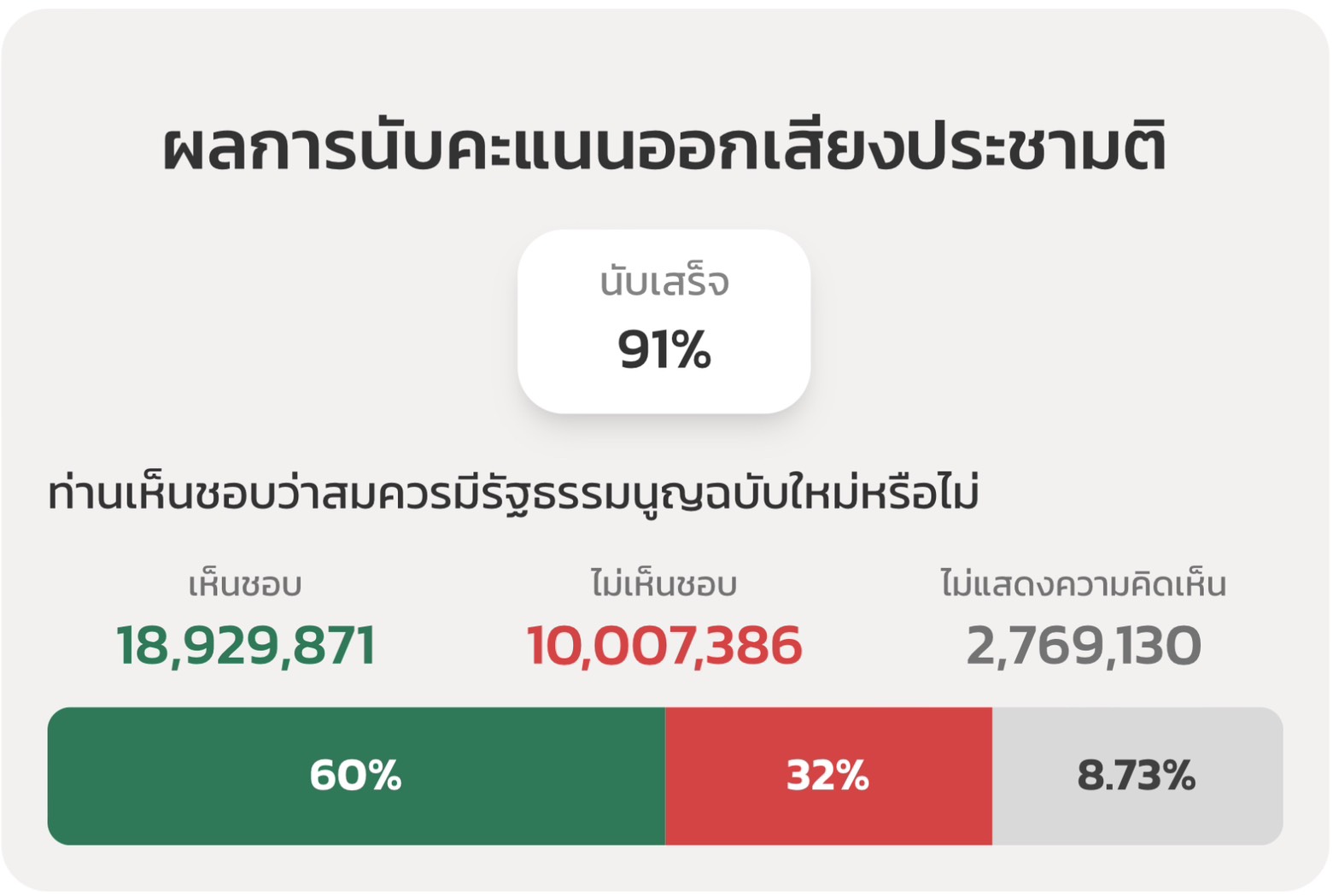 ผลนับคะแนนออกเสียง “ประชามติ” อย่างไม่เป็นทางการ นับแล้ว 91% หลังปิดหีบทั่วประเทศ พบประชาชนส่วนใหญ่โหวต “เห็นชอบ” คิดเป็นร้อยละ 60 ขณะที่ไม่เห็นชอบร้อยละ 32 และไม่แสดงความคิดเห็นร้อยละ 8.73