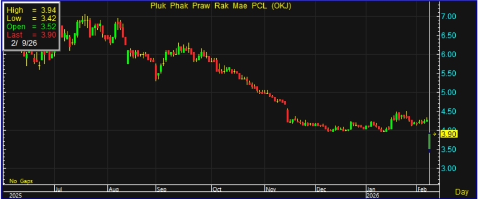 ผู้สื่อข่าวรายงานว่า วันนี้ (9 ก.พ. 69)ราคาหุ้น บริษัท ปลูกผักเพราะรักแม่ จำกัด (มหาชน)หรือ OKJ ณ เวลา 10:50 น. อยู่ที่ระดับ 3.90 บาท ลบ 0.36 บาท หรือ 8.45% สูงสุดที่ระดับ 3.94 บาท ต่ำสุดที่ระดับ 3.42 บาท ด้วยมูลค่าการซื้อขาย 33.69 ล้านบาท