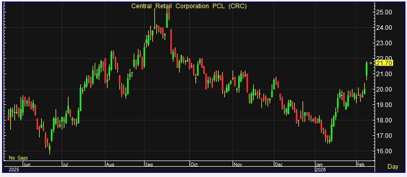 ผู้สื่อข่าวรายงานว่า วันนี้ (9 ก.พ.69) ราคาหุ้น บริษัท เซ็นทรัล รีเทล คอร์ปอเรชั่น จำกัด (มหาชน) หรือ CRC ณ เวลา 11:35 น. อยู่ที่ระดับ 21.70 บาท บวก 1.70 บาท หรือ 8.50% ราคาสูงสุด 21.80 บาท ราคาต่ำสุด 20.60 บาท ด้วยมูลค่าซื้อขาย 505.07 ล้านบาท
