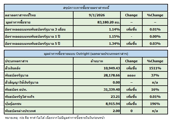 สมาคมตลาดตราสารหนี้ไทย (ThaiBMA) สรุปภาวะตลาดตราสารหนี้ไทยประจำวันนี้ มีมูลค่าการซื้อขายรวมทั้งวันอยู่ที่ 83,180 ล้านบาท ด้านประเภทของนักลงทุน ที่มีมูลค่าการซื้อขายสูงที่สุด 2 อันดับแรก คือ 1. กลุ่มบริษัทหลักทรัพย์จัดการกองทุน (บลจ.) ซื้อสุทธิ 7,423 ล้านบาท 2. กลุ่มบริษัทประกัน ซื้อสุทธิ 505 ล้านบาท ในขณะที่นักลงทุนต่างชาติ ซื้อสุทธิ 3,129 ล้านบาท