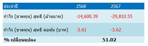 โดยผลการดำเนินงานปี 2568 ขาดทุนสุทธิลดลงเหลือ 1.46 หมื่นล้านบาท ปรับตัวดีขึ้น 51% จากช่วงเดียวกันของปีก่อนขาดทุนสุทธิมากถึง 2.98 หมื่นล้านบาท