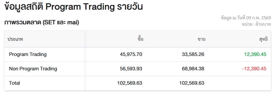 ผู้สื่อข่าวรายงานว่า วันนี้ (9 ก.พ.69) ตลาดหลักทรัพย์แห่งประเทศไทย (ตลท.) เปิดเผยข้อมูลซื้อขายรายวันผ่าน Program Trading หรือ “โปรแกรมโรบอทเทรดดิ้ง” พบว่ามีมูลค่าซื้อจำนวน 45,975.70 ล้านบาท และมูลค่าขายจำนวน 33,585.26 ล้านบาท เท่ากับซื้อสุทธิ 12,390.45 ล้านบาท