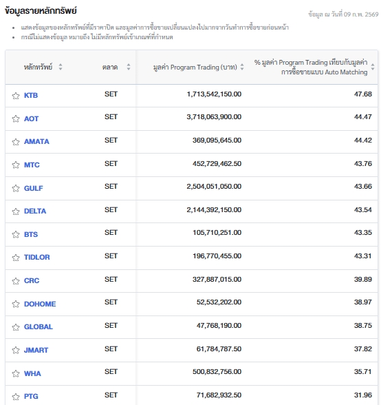 โดยธนาคารกรุงไทย จำกัด (มหาชน) หรือ KTB มีมูลค่าการซื้อขายผ่าน Program Trading จำนวน 1.71 พันล้านบาท คิดเป็น 47.68% ของมูลค่าการซื้อขายแบบ Auto Matching ซึ่งอยู่ที่ 3.59 พันล้านบาท