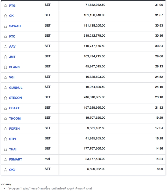 นอกจากนี้ ตลาดหลักทรัพย์แห่งประเทศไทย (ตลท.) รายงานข้อมูลหลักทรัพย์ที่มีการซื้อขายผ่านระบบ Program Trading สูงสุด โดยพิจารณาจากสัดส่วนมูลค่า Program Trading เทียบกับมูลค่าการซื้อขายแบบ Auto Matching พบว่ามี หลักทรัพย์ที่มีการทำรายการสูงสุดในวันนี้ ได้แก่