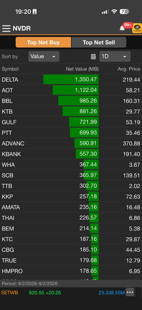โดยล่าสุด(9ก.พ.69)จากข้อมูล Top Net Buy NVDR พบว่า หุ้นที่นักลงทุนต่างชาติซื้อสุทธิมากที่สุด นำโดย DELTA มูลค่าประมาณ 1,350 ล้านบาท ตามมาด้วย AOT ราว 1,122 ล้านบาท, BBL ประมาณ 985 ล้านบาท,BBL ราว 985 ล้านบาท และ KTB ราว 881 ล้านบาท สะท้อนความเชื่อมั่นต่อหุ้นกลุ่มเทคโนโลยี โครงสร้างพื้นฐาน และกลุ่มธนาคารพาณิชย์ขนาดใหญ่ ซึ่งเป็นแกนหลักของดัชนี