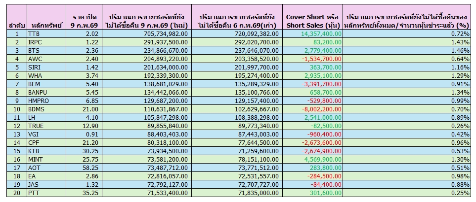 ข้อมูลสิ้นสุด 9 ก.พ.69 พบ TTB มีปริมาณชอร์ตคงค้างเหลือมากสุด 705 ล้านหุ้น คิดเป็น 0.72% และถูก Cover Short สูงสุด 14 ล้านหุ้น ขณะที่ BDMS ถูก Short Sales สูงสุด 8 ล้านหุ้น
