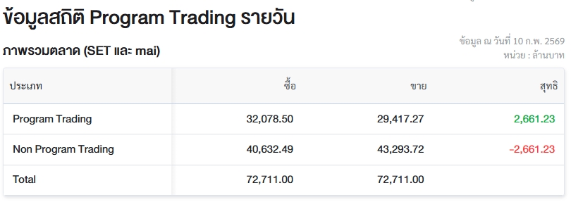 ผู้สื่อข่าวรายงานว่า วันนี้ (10 ก.พ.69) ตลาดหลักทรัพย์แห่งประเทศไทย (ตลท.) เปิดเผยข้อมูลซื้อขายรายวันผ่าน Program Trading หรือ “โปรแกรมโรบอทเทรดดิ้ง” พบว่ามีมูลค่าซื้อจำนวน 32,078.50 ล้านบาท และมูลค่าขายจำนวน 29,417.27 ล้านบาท เท่ากับซื้อสุทธิ 2,661.23 ล้านบาท