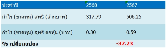 บริษัทรายงานผลการดำเนินงานในปี 2568 มีกำไรสุทธิ 317.8 ล้านบาท ลดลงร้อยละ 37.2 เมื่อเทียบกับงวดเดียวของปีก่อนที่มีกำไรสุทธิ 506.2 ล้านบาท โดยมีสาเหตุมาจากการลดลงของรายได้จากการดำเนินงาน