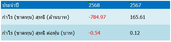 บริษัทรายงานผลการดำเนินงานในปี 2568 มีกำไรสุทธิ 784.97 ล้านบาท เมื่อเทียบกับงวดเดียวของปีก่อนที่มีกำไรสุทธิ 165.61 ล้านบาท โดยมีสาเหตุหลักมาจากการขาดทุนจากการปรับมูลค่ายุติธรรมของ อสังหาริมทรัพย์เพื่อการลงทุน