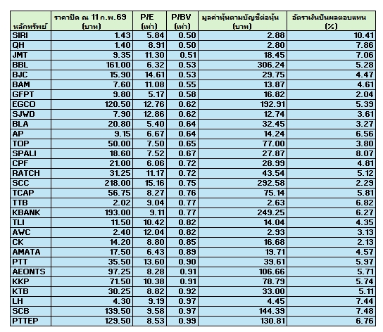 จังหวะเช่นนี้จึงเป็นช่วงเวลาที่นักลงทุนสายคุณค่า (Value Investor) เริ่มมองหา “ของดีราคายังไม่แพง” โดยเฉพาะหุ้นที่มีค่า P/E ต่ำกว่า 15 เท่า และ P/BV ต่ำกว่า 1 เท่า ซึ่งสะท้อนว่าราคาตลาดยังซื้อขายต่ำกว่ามูลค่าทางบัญชี และกำไรยังไม่ถูกให้ราคาในระดับสูง