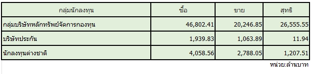 สมาคมตลาดตราสารหนี้ไทย (ThaiBMA) สรุปภาวะตลาดตราสารหนี้ไทยประจำวันนี้ มีมูลค่าการซื้อขายรวมทั้งวันอยู่ที่ 112,980 ล้านบาท ด้านประเภทของนักลงทุน ที่มีมูลค่าการซื้อขายสูงที่สุด 2 อันดับแรก คือ 1. กลุ่มบริษัทหลักทรัพย์จัดการกองทุน (บลจ.) ซื้อสุทธิ 26,556 ล้านบาท 2. กลุ่มบริษัทประกัน ซื้อสุทธิ 12 ล้านบาท ในขณะที่นักลงทุนต่างชาติ ซื้อสุทธิ 1,271 ล้านบาท ส่วน Yield พันธบัตรอายุ 5 ปี ปิดที่ 1.3% ไม่มีการเปลี่ยนแปลงจากเมื่อวาน