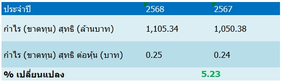ทั้งนี้ คณะกรรมการบริษัทมีมติเห็นชอบเสนอที่ประชุมสามัญผู้ถือหุ้นประจำปี 2569 เพื่อพิจารณาอนุมัติการจัดสรรกำไรสุทธิประจำปี 2568 ในอัตรา 0.2072 บาทต่อหุ้น โดยได้จ่ายเงินปันผลระหว่างกาลแล้วในอัตราหุ้นละ 0.1637 บาท เมื่อวันที่ 9 ธันวาคม 2568 และคงเหลือเสนอจ่ายเงินปันผลสำหรับงวดสิ้นปีในอัตราหุ้นละ 0.0435 บาท กำหนดจ่ายในวันที่ 8 พฤษภาคม 2569 ภายหลังได้รับอนุมัติจากที่ประชุมผู้ถือหุ้น