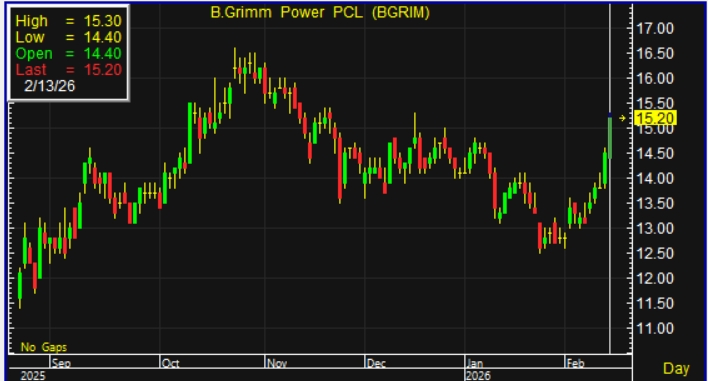 ผู้สื่อข่าวรายงานว่า วันนี้ (13 ก.พ.69) ราคาหุ้น บริษัท บี.กริม เพาเวอร์ จำกัด (มหาชน) หรือ BGRIM ณ เวลา 11:32 น. อยู่ที่ระดับ 15.20 บาท บวก 0.70 บาท หรือ 4.83% สูงสุดที่ระดับ 15.30 บาท ต่ำสุดที่ระดับ 14.40 บาท ด้วยมูลค่าการซื้อขาย 399.81 ล้านบาท