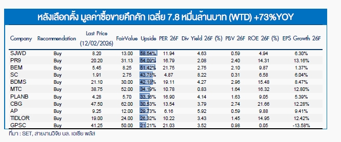 ฝ่ายวิจัย บริษัทหลักทรัพย์ เอเซีย พลัส จำกัด (มหาชน) ประเมินว่า ภายหลังการเลือกตั้งปี 2569 ผ่านพ้นมา 4 วันทำการ ตลาดหุ้นไทยปรับตัวเพิ่มขึ้น 6.4% ในรอบสัปดาห์ (WTD) ส่งผลให้มูลค่าหลักทรัพย์ตามราคาตลาด (Market Capitalization) เพิ่มขึ้นราว 1.2 ล้านล้านบาท จาก 17.0 ล้านล้านบาท สู่ระดับ 18.2 ล้านล้านบาท สะท้อนความเชื่อมั่นของนักลงทุนที่ฟื้นตัวอย่างมีนัยสำคัญ