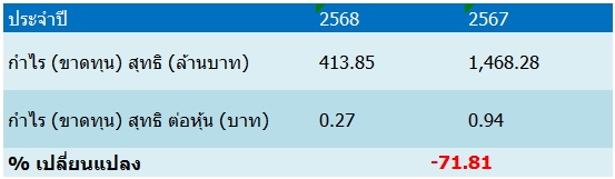 บริษัทฯ รายงานผลการดำเนินงานปี 2568 มีกำไรสุทธิ 413.85 ล้านบาท ลดลงร้อยละ 71.81 จากปีก่อน มีกำไรสุทธิ 1,468.28 ล้านบาท โดยมีรายได้รวม 5,335.62 ล้านบาท เทียบกับปี 2567 ที่มีรายได้รวม 6,267.15 ล้านบาท สาเหตุหลักจากการแข็งค่าของสกุลเงินบาทเมื่อเทียบกับดอลลาร์สหรัฐ