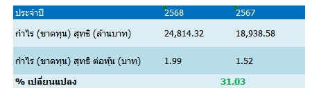 ทั้งนี้ เสนอจ่ายเงินปันผลในอัตราหุ้นละ 0.60 บาท โดยวันที่ไม่ได้รับสิทธิปันผล(XD) 26 ก.พ. 2569 กำหนดรายชื่อผู้ถือหุ้นที่มีสิทธิรับเงินปันผล (Record Date) ในวันที่ 27 กุมภาพันธ์ 2569 และกำหนดจ่ายเงินปันผลในวันที่ 28 เมษายน 2569 ทั้งนี้ การจ่ายเงินปันผลดังกล่าวจะขึ้นอยู่กับการอนุมัติของที่ประชุมสามัญผู้ถือหุ้นประจำปี 2569