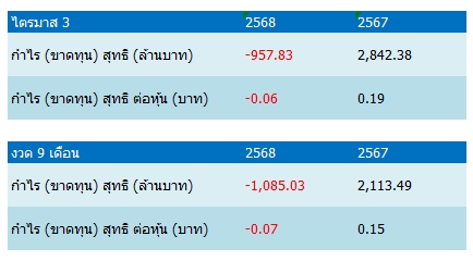 สำหรับผลการดำเนินงานงวด 9 เดือนของปี 2568/69 บริษัทฯ บันทึกรายได้รวมจำนวน 21,847 ล้านบาท เพิ่มขึ้นร้อยละ 2.9 หรือ 620 ล้านบาท จากปีก่อน ปัจจัยหลักมาจากการเพิ่มขึ้นของรายได้ของ RABBIT และ ROCTEC จำนวนรวม 5,013 ล้านบาท แม้ว่าจะไม่มีการบันทึกกำไรพิเศษจำนวน 3,368 ล้านบาท เหมือนปีก่อนหน้า ด้านค่าใช้จ่ายรวมอยู่ที่ 16,227 ล้านบาท เพิ่มขึ้นร้อยละ 20.6 หรือ 2,774 ล้านบาท