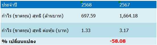 บริษัทรายงานผลการดำเนินงานในไตรมาส 4 ปี 2568 มีกำไรสุทธิ 697.59 ล้านบาท ลดลงร้อยละ 58.08 เมื่อเทียบกับงวดเดียวของปีก่อนที่มีกำไรสุทธิ 1,664.18 ล้านบาท โดยมีสาเหตุหลักจากบริษัทมีรายได้ในปี 2568 ทั้งสิ้น 15,187.50 ล้านบาท ลดลงจากปีก่อน 5,770.16 ล้านบาท คิดเป็นร้อยละ 27.53