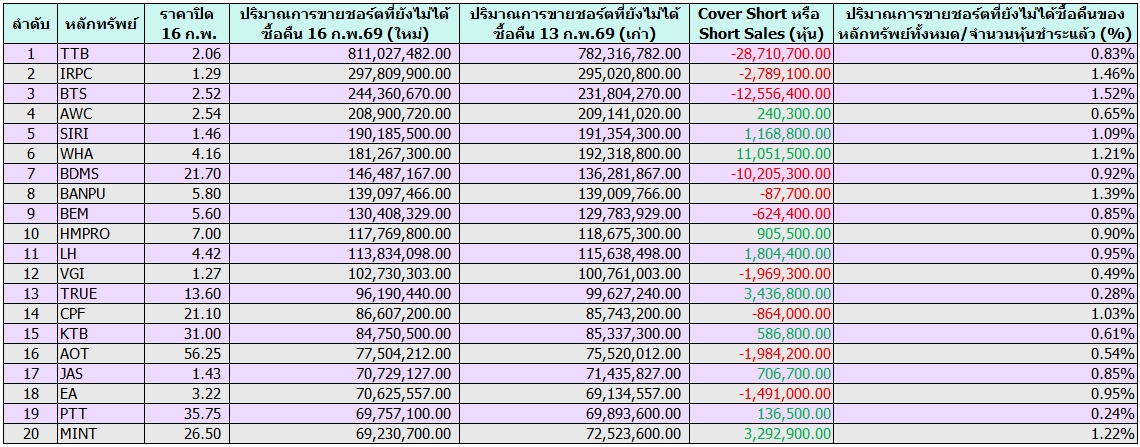 ข้อมูลสิ้นสุด 17 ก.พ.69 พบ TTB มีปริมาณชอร์ตคงค้างเหลือมากสุด 811 ล้านหุ้น คิดเป็น 0.83% และถูก Short Sales สูงสุด 28 ล้านหุ้น ส่วน WHA ถูก Cover Short สูงสุด 11 ล้านหุ้น
