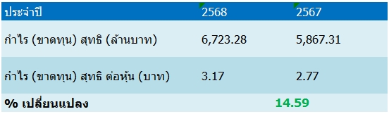 บริษัทรายงานผลการดำเนินงานปี 68 มีกำไรสุทธิรวม 6,723.28 ล้านบาท เพิ่มขึ้น 14.59% เมื่อเทียบกับงวดเดียวกันของปีก่อนมีกำไรสุทธิ 5,867.31 ล้านบาท