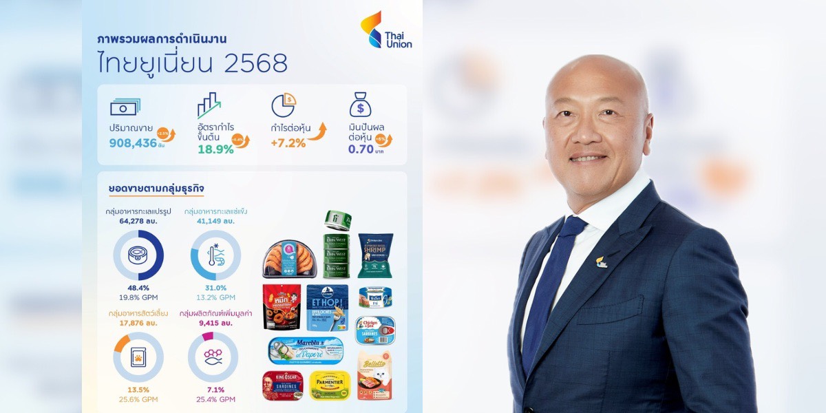 บริษัท ไทยยูเนี่ยน กรุ๊ป จำกัด (มหาชน) หรือ TU รายงานผลประกอบการปี 2568 ด้วยยอดขายรวม 132,719 ล้านบาท และปริมาณการขาย 908,436 แสนตัน เพิ่มขึ้น 2.5% จากปีก่อน เป็นผลจากการเติบโตของกลุ่มผลิตภัณฑ์อาหารทะเลแปรรูป อาหารทะเลแช่แข็ง และอาหารสัตว์เลี้ยง ขณะที่อัตรากำไรขั้นต้นขยายตัวทะลุ 18.9 % สูงสุดเป็นประวัติการณ์ สะท้อนความสามารถในการบริหารจัดการที่มีประสิทธิภาพและการปรับตัวอย่างรวดเร็ว